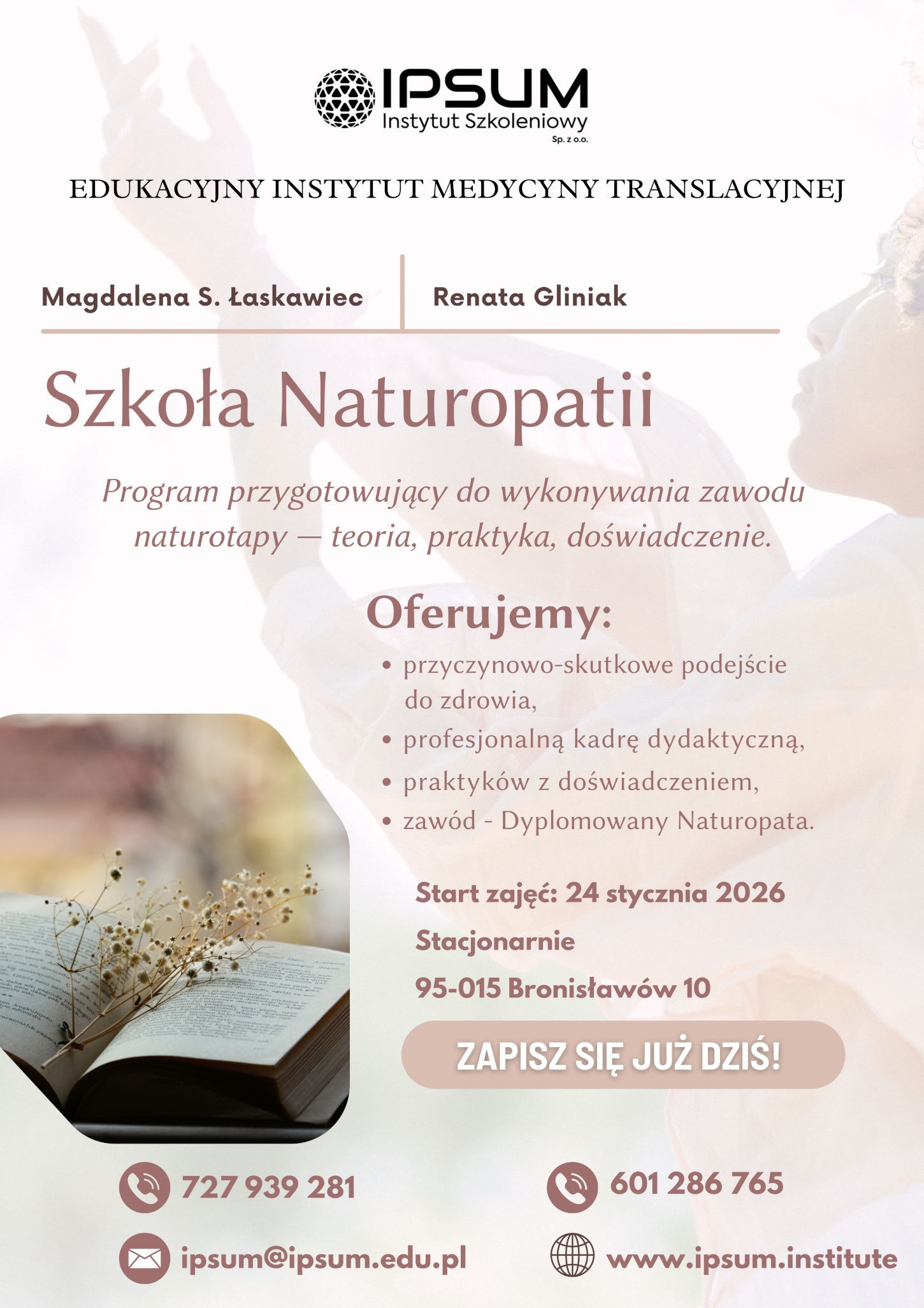 Razem z Mistrzynią Naturopatii, bioenergoterapeutą Magdaleną S. Łaskawiec założyłyśmy Szkołę Naturopatii.